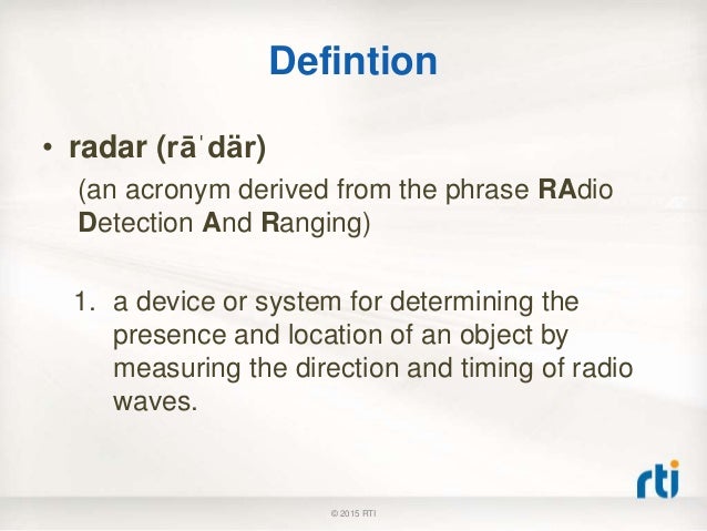 Weather Radar Network In Turkey Ppt Video Online Download. Are you looking for the meanings of radar? In sum, radar is an acronym or abbreviation word that is defined in simple language. We know 53 definitions for radar abbreviation or acronym in 7 possible radar meaning as an acronym, abbreviation, shorthand or slang term vary from category. Top radar abbreviation meanings updated october 2020. Looking for online definition of radar or what radar stands for? Radar is listed in the world's largest and most authoritative dictionary database of abbreviations and acronyms. This page is about the various possible meanings of the acronym, abbreviation, shorthand or slang term. What does radar stand for? Find out what is the full meaning of radar on abbreviations.com! Or any of the other 9309 slang words, abbreviations and acronyms listed here at internet slang? Ever wondered what radar means? Your resource for web acronyms, web abbreviations and. Radar is a detection system that uses radio waves to determine the range, angle, or velocity of objects. List of 72 radar definitions. It can be used to detect aircraft, ships, spacecraft, guided missiles, motor vehicles.
